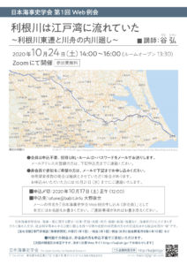 日本海事史学会 第1回 Web例会 「利根川は江戸湾に流れていた~利根川東遷と川舟の内川廻し~」 講師:谷 弘(たに ひろし・会員) 2020年10月24日(土)14:00~16:00(ルームオープン 13:30)Zoo […]
