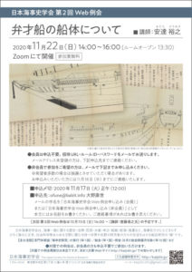 日本海事史学会 第2回 Web例会 「弁才船の船体について」 講師:安達 裕之(あだち ひろゆき・会員) 2020年11月22日(日)14:00~16:00(ルームオープン 13:30)Zoomにて開催