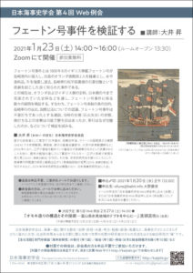日本海事史学会 第4回 Web例会 「フェートン号事件を検証する」 講師:大井 昇(おおい のぼる・会員) 2021年1月23日(土)14:00~16:00(ルームオープン 13:30)Zoomにて開催 フェートン号事件 […]