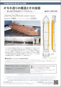 日本海事史学会 第5回 Web例会 「オモキ造りの構造とその技術 ―富山県氷見地域のドブネを中心に―」 講師:廣瀬 直樹(ひろせ なおき・会員) 2021年2月28日(日)14:00~16:00(ルームオープン 13:3 […]